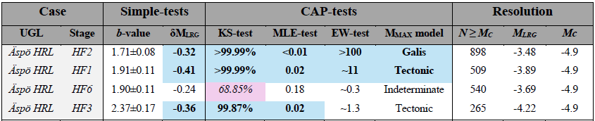 All the stages at the Äspö HRL appear to have some evidence of a bound process restricting the growth of earthquake magnitudes. The most convincing of the cases is also the most well-resolved one: for HF2, all the simple/CAP-tests unanimously indicate a bound process with strong statistical significance. As the cases become less well-resolved, the statistical confidence also diminishes. For example, the HF1 and HF3 stages have most CAP-tests indicating a bound process, only the EW-test of HF3 narrowly falls short of statistical significance. The HF6 stage produces the most mixed results: simple-tests, MLE-test, and EW-test are indeterminate, while the KS-test is unbound. It is worthwhile to mention that HF6 differed in stimulation approach in two ways: the first sub-stage of HF6 was the largest injected volume (with reduced volume for later sub-stages) and the last three sub-stages were performed on a different day.