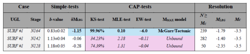 The first consideration is the consistency among simple/CAP-test results. Cases that are truly bound tend to have all tests unanimously indicate a bound process, and vice versa. For reference, sensitivity testing on bound real-data that was sequentially decimated indicated a loss of resolving power, consistent with the degree of decimation (Schultz et al., 2025). Specifically, the EW-test tends to lose resolving power first, followed by the KS-test, with the MLE-test generally being the most sensitive. In fact, the use of multiple sub-tests rooted in disparate statistical methods was an intentional design choice to cover strength/deficiencies of each individual approach (Schultz, 2024). Note that this consistency indicator is only relevant for semi-well-resolved cases that are truly bound; very-poorly-resolved cases would still appear as unbound.