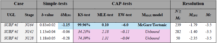 To begin assessing if some process might be restricting magnitude growth at SURF Experiment #1, we fit the GR-MFD to the catalogue data from each injection stage (i.e., N164, N142, N128). To account for magnitude errors, we employ a 50-trial bootstrap process in which the catalogue magnitudes are dithered by  ± 0.1 (this includes a dithered Mc). Only one of the stages (N164) appear to be appreciably deficient in large magnitude events (Fig. 8). Correspondingly, the δMLRG discrepancy is significant for N164 (−1.15M), but fairly small for N142 (−0.05M) and N128 (−0.28M). Assuming an unbound catalogue, the δMLRG discrepancy for N164 would be a < 1st percentile event; stages N142 (10th percentile) and N128 (33rd percentile) are more commonly expected occurrences. These initial assessments are suggestive of some MMAX upper bound restricting catalogue growth for one stage at SURF Experiment #1.