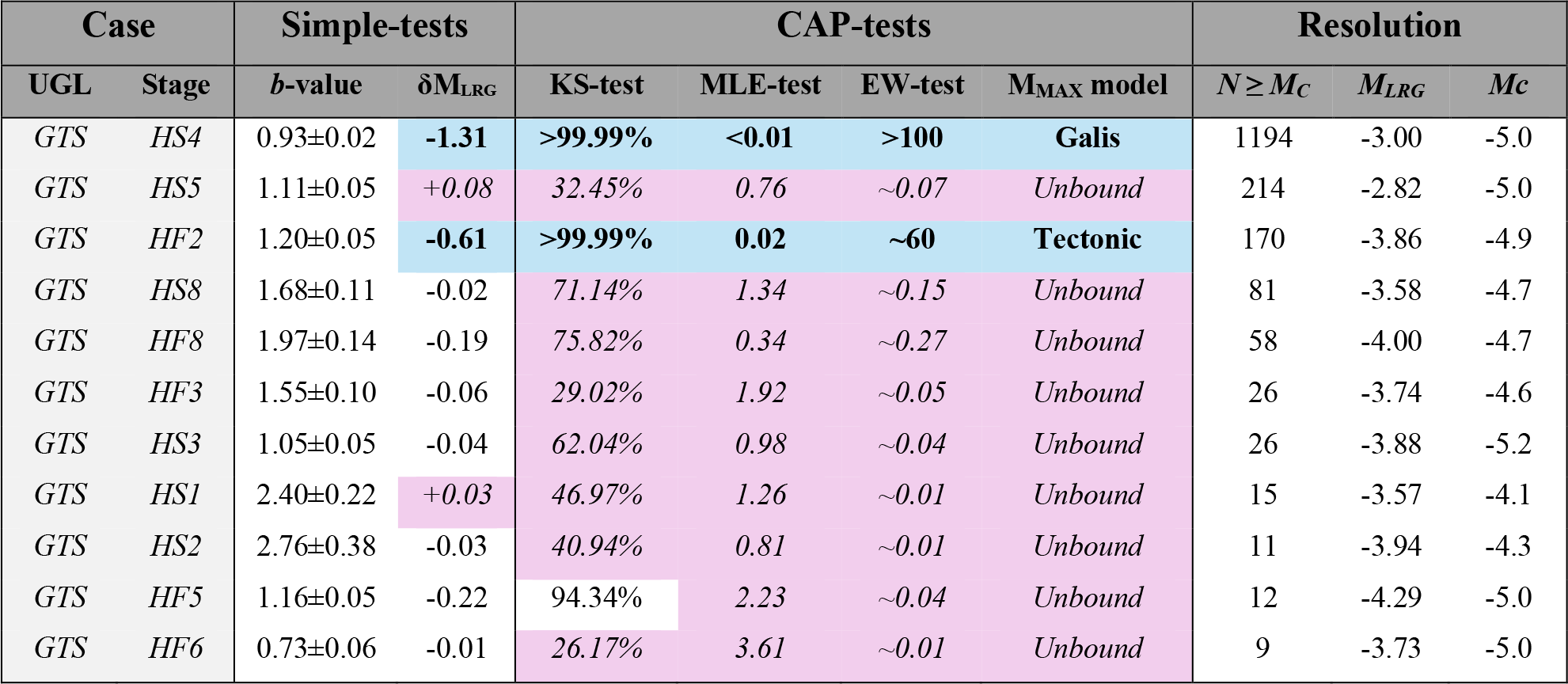 The application of CAP-tests to relatively larger magnitude induced seismicity cases found that these cases behaved in an unbound manner (Schultz, 2024) – suggesting that the use of theoretical MMAX models (McGarr, 2014; Hallo et al., 2014; Galis et al., 2017; Elsworth, et al., 2025; Im and Avouac, 2025; Sáez et al., 2025) are not appropriate during these fault reactivations. On the other hand, smaller-scale cases of induced seismicity (e.g., Utah FORGE, Preston New Road, Helsinki St1) from hydraulic stimulation indicated strong evidence for bound magnitude growth via an MMAX (Schultz et al., 2025). Furthermore, some stimulation stages transitioned from a bound process into an unbound one; this was interpreted as these particular stages reactivating pre-existing faults instead of stimulating new fractures. That said, subsurface unknowns/uncertainties hamper an unambiguous interpretation for these field-scale cases.